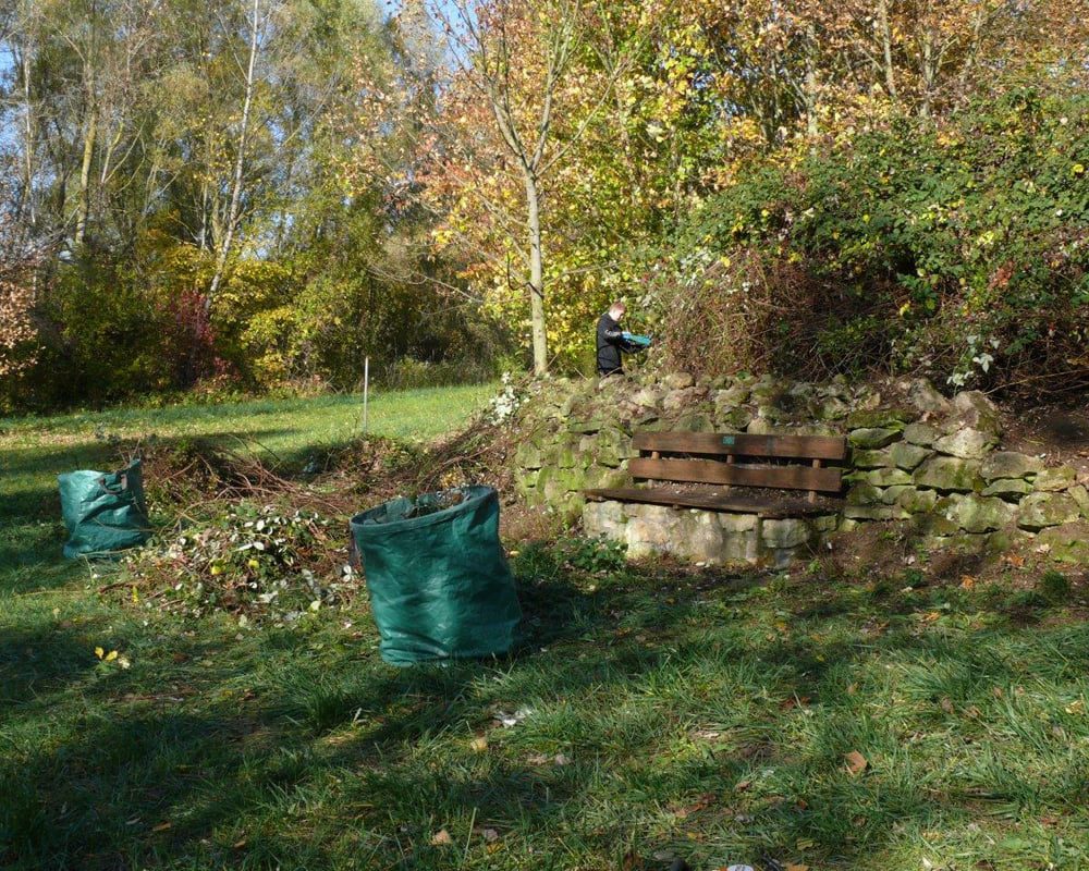 Mittlerweile hatte die Brombeerhecke alles überwuchert, was dort vor einiger Zeit von der FWG so schön angelegt worden war. Nach dem Rückschnitt ist nun alles wieder zu sehen: die Natursteinmauer, genauso wie die Sitzbank.
